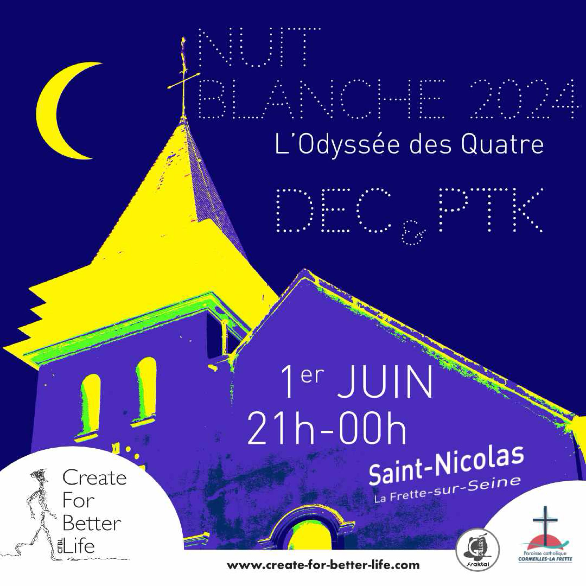 Pour une seconde édition, l'Eglise Saint-Nicolas fait sa Nuit Blanche, le 1er juin à La Frette-sur-Seine. DEC et PTK, artistes frettois délivrent un message universel, ouvert à tous. Leur installation « L'Odyssée des Quatre », lumineuse et immersive, sera en accès libre dès 21h00 et jusqu'à minuit. Chacun pourra venir découvrir l'univers raconté qui respecte le lieu tout en lui attribuant une dimension audiovisuelle le temps d'une illusion de quelques heures à peine...